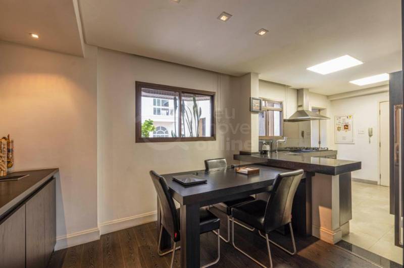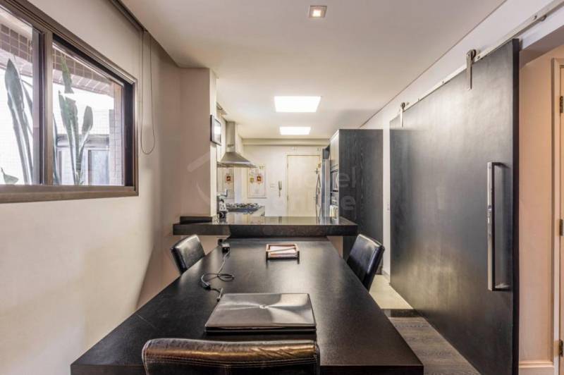 O apartamento possui três suítes, um quarto e uma dependência de empregada completa. Além disso, possui três vagas de garagem demarcadas. O imóvel conta com um total de cinco banheiros, sala de estar e sala de jantar com lareira. Ele passou por uma reforma há cinco anos.