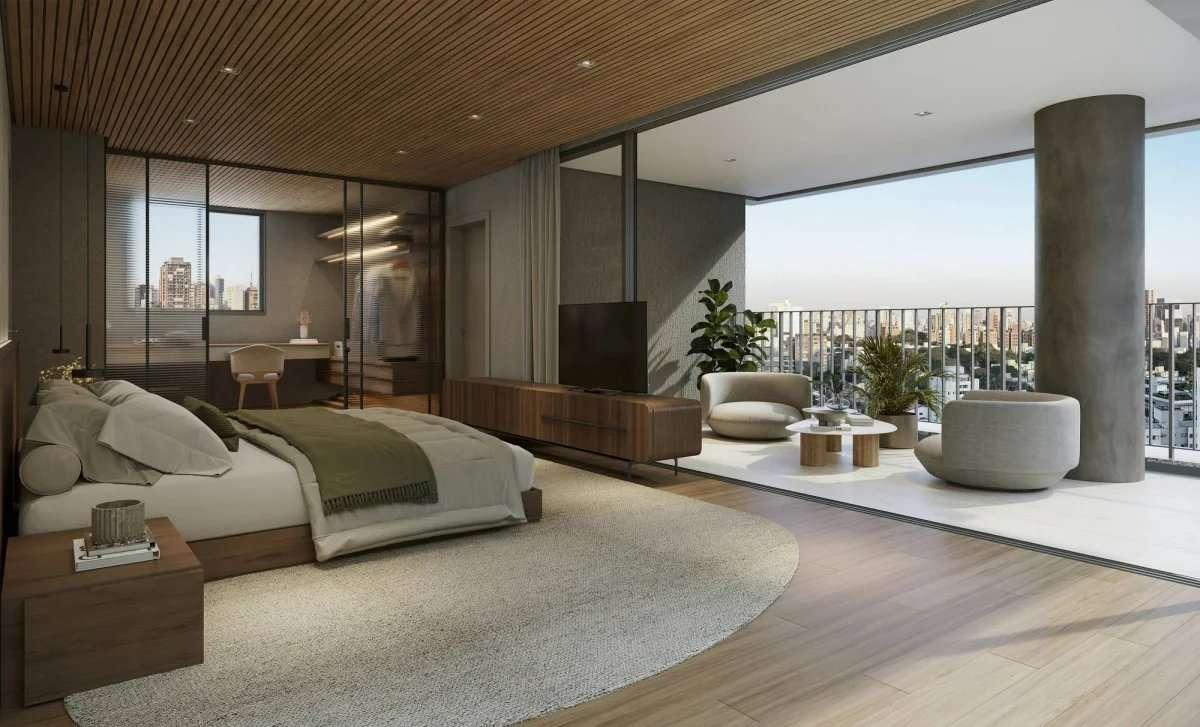 O projeto arquitetônico resgata a elegância da arquitetura paulistana dos anos 1960, com fachada em concreto aparente e painéis amadeirados deslizantes, que proporcionam um visual sofisticado e atemporal. O apartamento oferece ambientes com iluminação natural abundante, ventilação cruzada e uma vista privilegiada, criando uma atmosfera acolhedora e integrada à natureza ao redor.