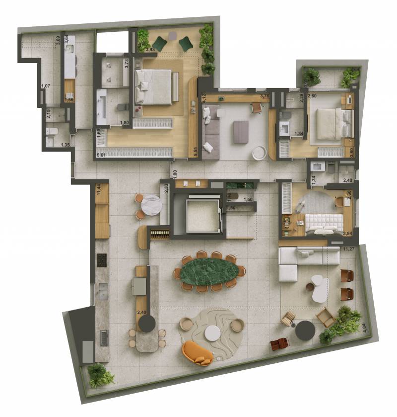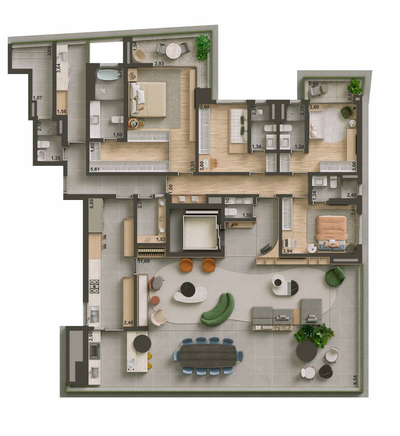 O Brooklin nunca viu plantas tão bem resolvidas. As unidades foram concebidas como casas nas alturas, com amplos terraços e vãos livres abertos para a vista, e com integração da área social, da cozinha e do espaço gourmet.