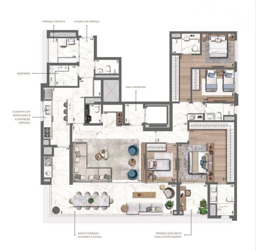 Desfrute de um lazer completo e sofisticado, um hall social privativo que recebe você com exclusividade, uma cozinha iluminada e ventilada naturalmente, e um amplo terraço gourmet e social, perfeito para criar memórias inesquecíveis ao lado de seus amigos e entes queridos.