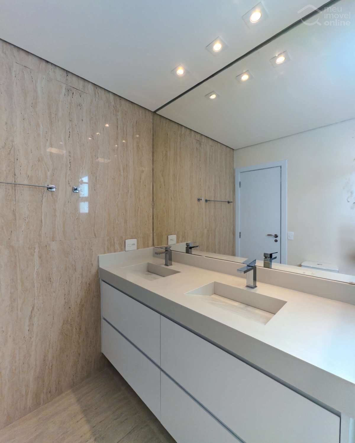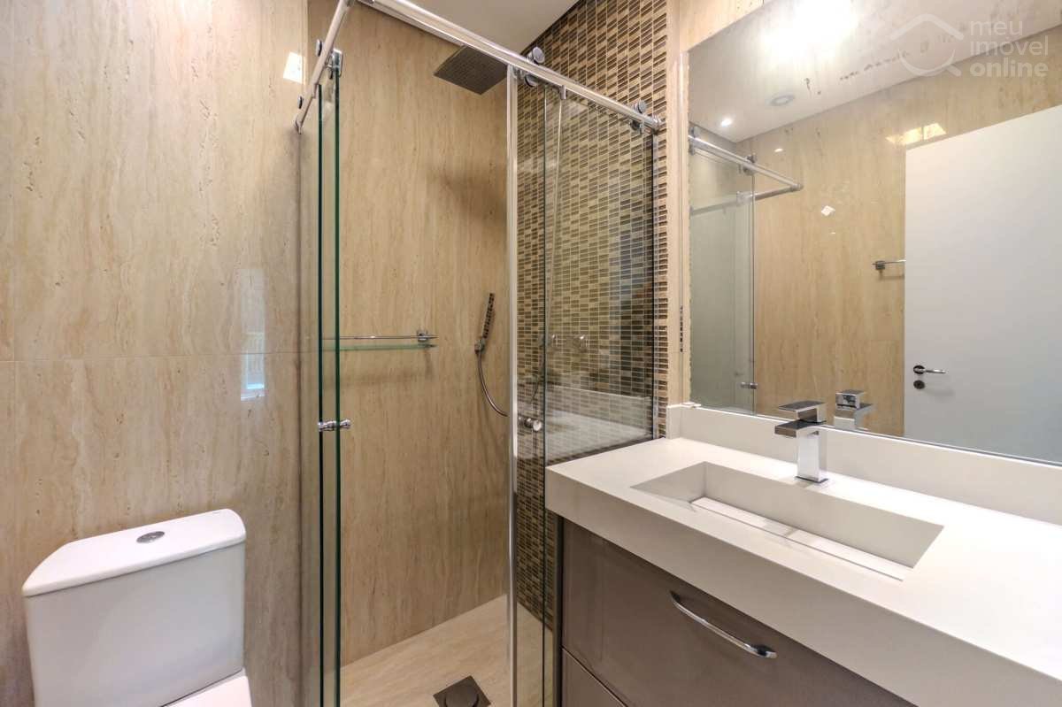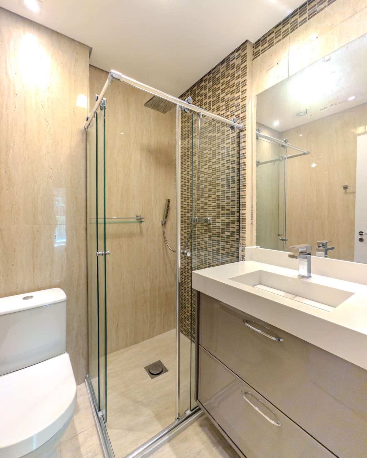 Banheiros sofisticados, com acabamentos de qualidade e mobiliário funcional