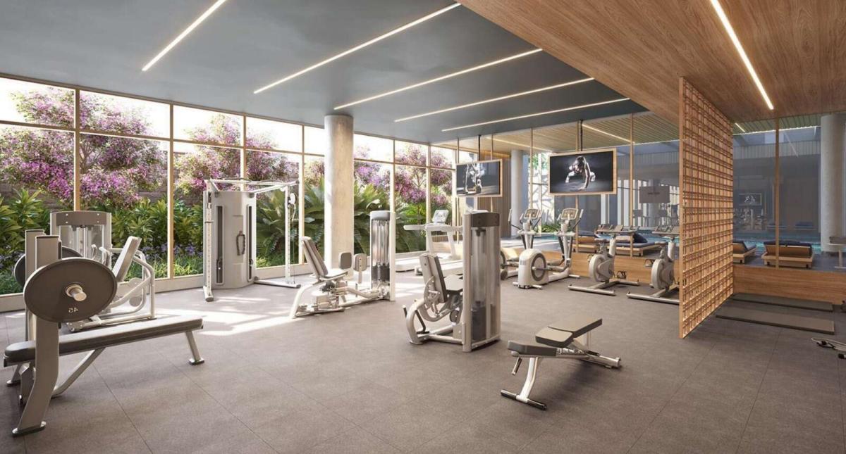 A área social é ampla e contínua, composta por três ambientes bem definidos, estar, jantar e convivência, todos conectados a um terraço generoso, criando uma extensão natural do living e favorecendo luz natural abundante. A cozinha, com ilha central, se integra de forma elegante ao espaço social, reforçando o conceito contemporâneo de convivência, enquanto mantém apoio funcional por uma área de serviço completa, com dependência e acesso independente.