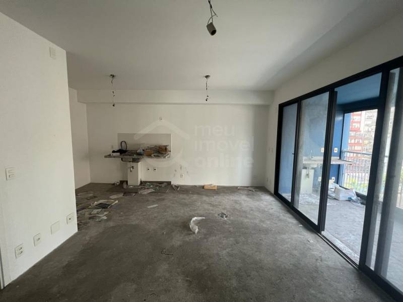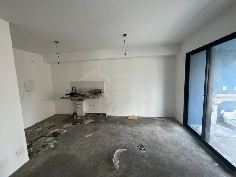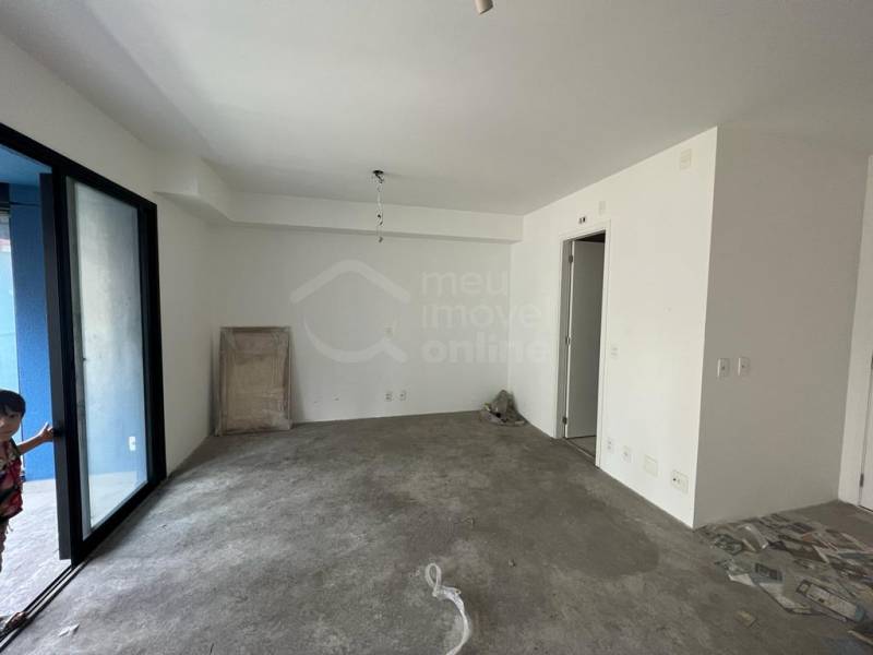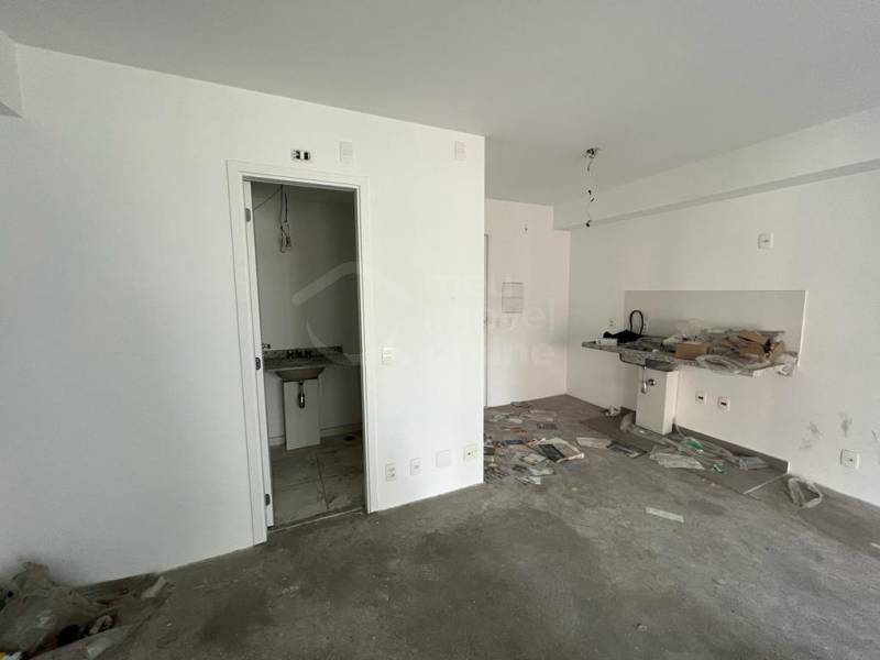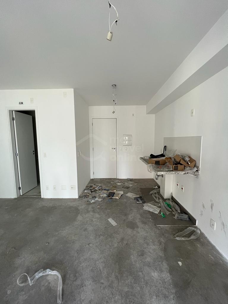 Studio ainda no contrapiso, ampla varanda já envidraçada, aquecedor de passagem instalado e 1 vaga de garagem.