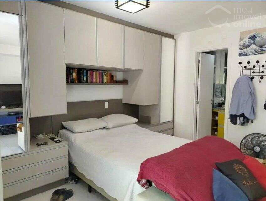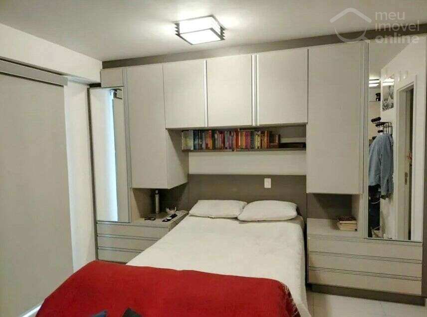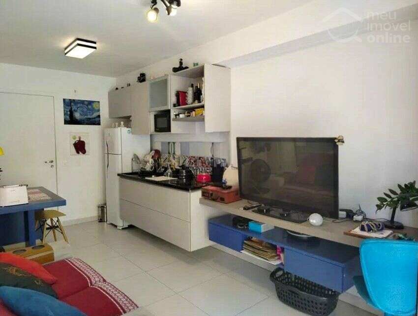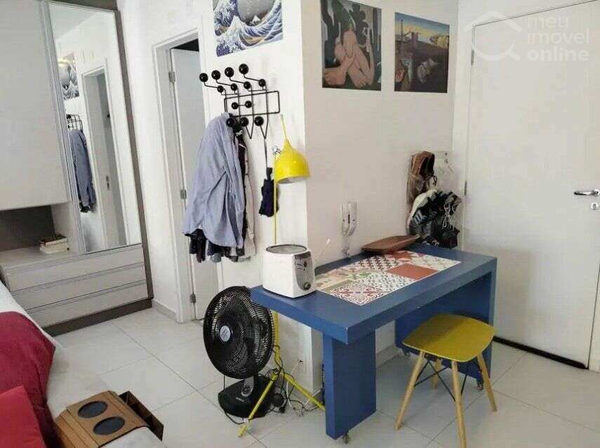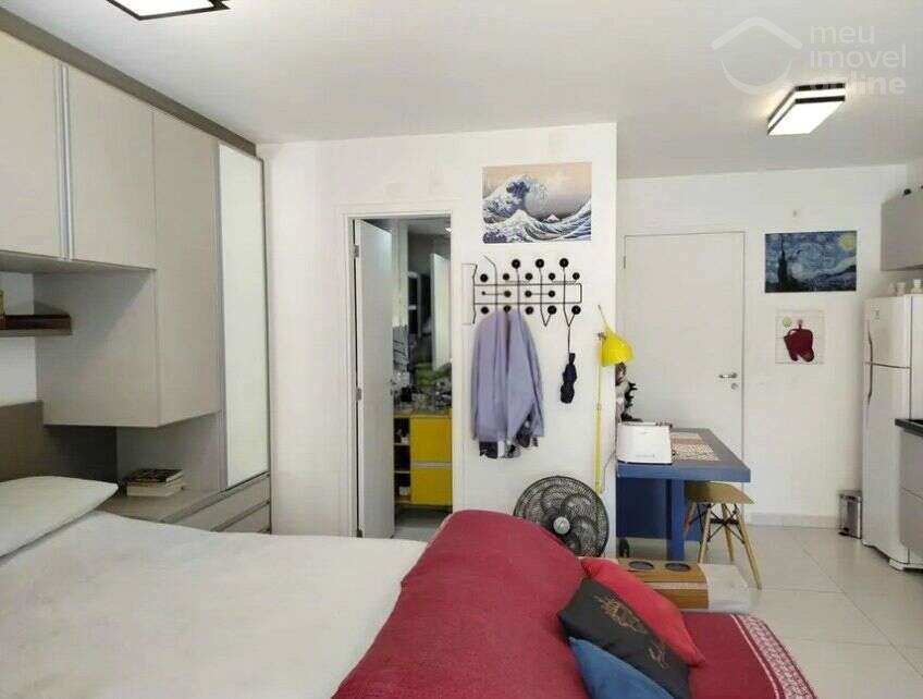 Studio reformado com armários planejados, ampla varanda e 1 vaga de garagem.