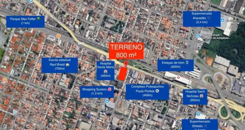 Terreno comercial com 800 m² com 3 casas, localizado em região estratégica de Suzano, a poucos metros da Estação de Trem, com alto fluxo de pessoas e veículos.
